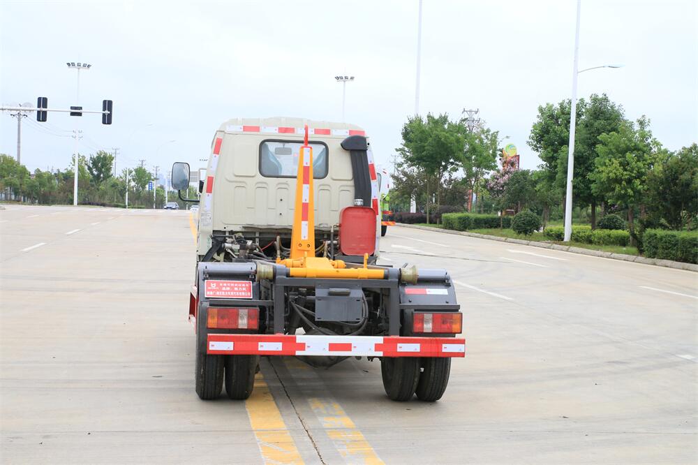 該款鉤臂式垃圾車由液壓系統、操作系統組成。舉升油制缸(1支)系國內知名液壓件廠家生產的雙作用油缸。垃圾廂可自吊上放下,可自行傾倒垃圾,上下一次工作循環時間≤50S。該車的特點是一個車能配多個垃圾廂,能實現一臺車與多個垃圾廂聯合作業,循環運輸,充分提高了車輛的運輸能力。