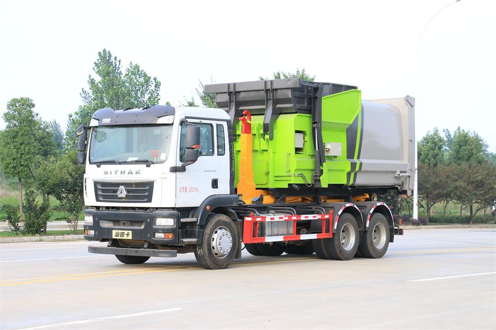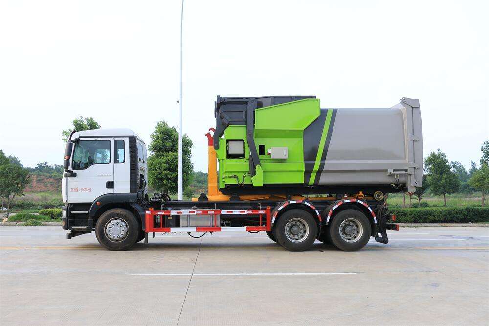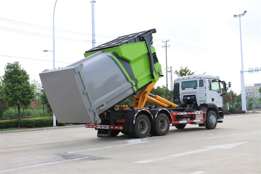 勾臂式垃圾車(車廂可卸式垃圾車)介紹: 車廂可卸式垃圾車又叫拉臂式垃圾車,是一種采用高新設計可伸縮的鉤臂,實現垃圾廂的二次吊裝,自吊上放下,可自行傾倒垃圾的環衛設備。 拉臂式垃圾車結構簡單,操作穩定方便,裝卸效率高,機械化程度高,節省人力。鉤臂垃圾車一車可帶多個垃圾廂,在裝卸的運輸過程中可有效地避免二次污染。 拉臂垃圾車采用高新設計可擺動的鉤臂,垃圾箱由框架、開啟油缸、滑輪、后門和若干加強框架與鋼板焊接而成。調換貨廂快捷方便,貨廂上帶蓋(倒垃圾時可翻開),鉤臂垃圾車垃圾廂體可選用碳鋼、不銹鋼材質、內部采取環氧樹脂防腐處理,改裝部分與原車底盤為可分離式,維修方便且保持了原車的機動性及行駛性能。