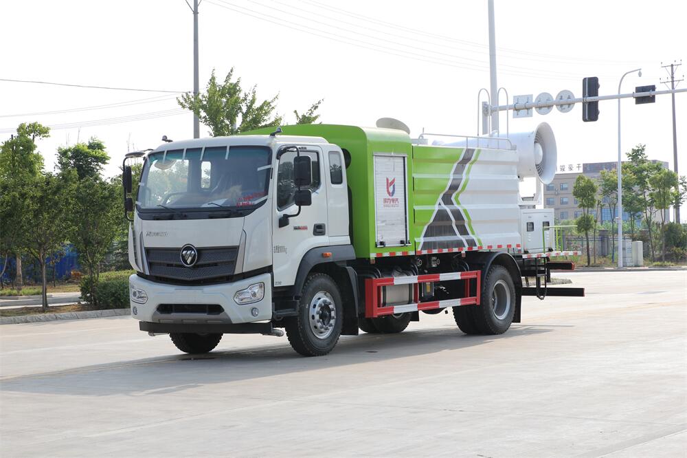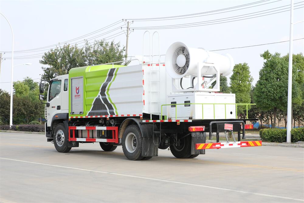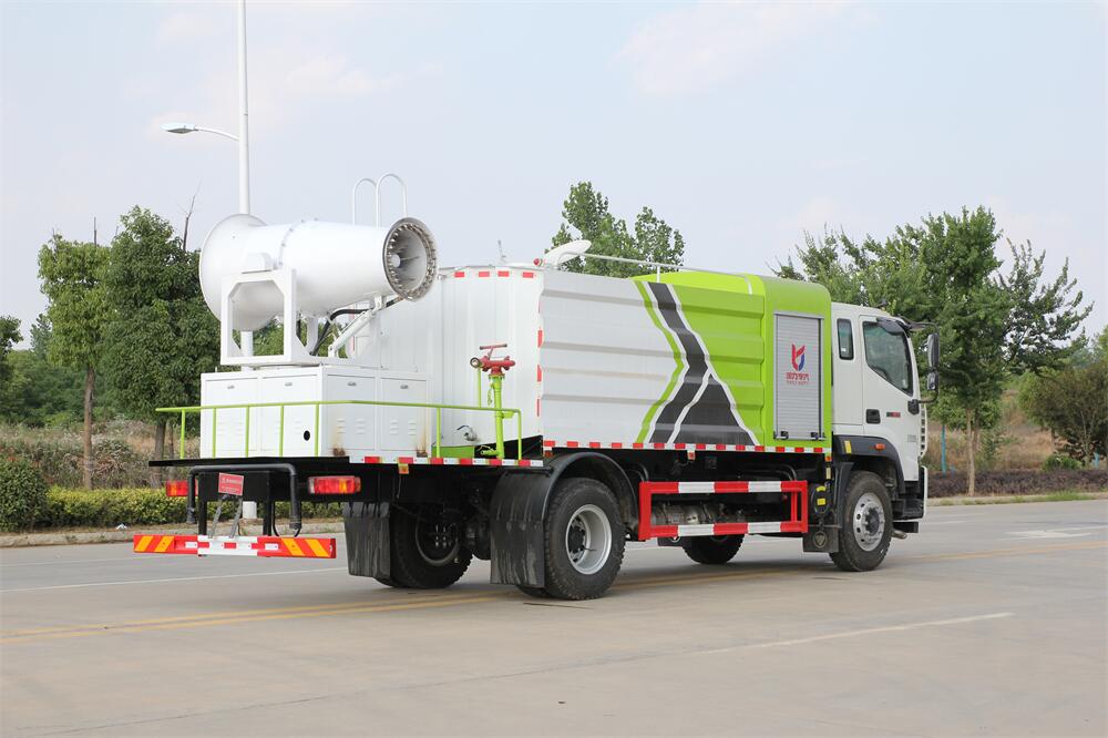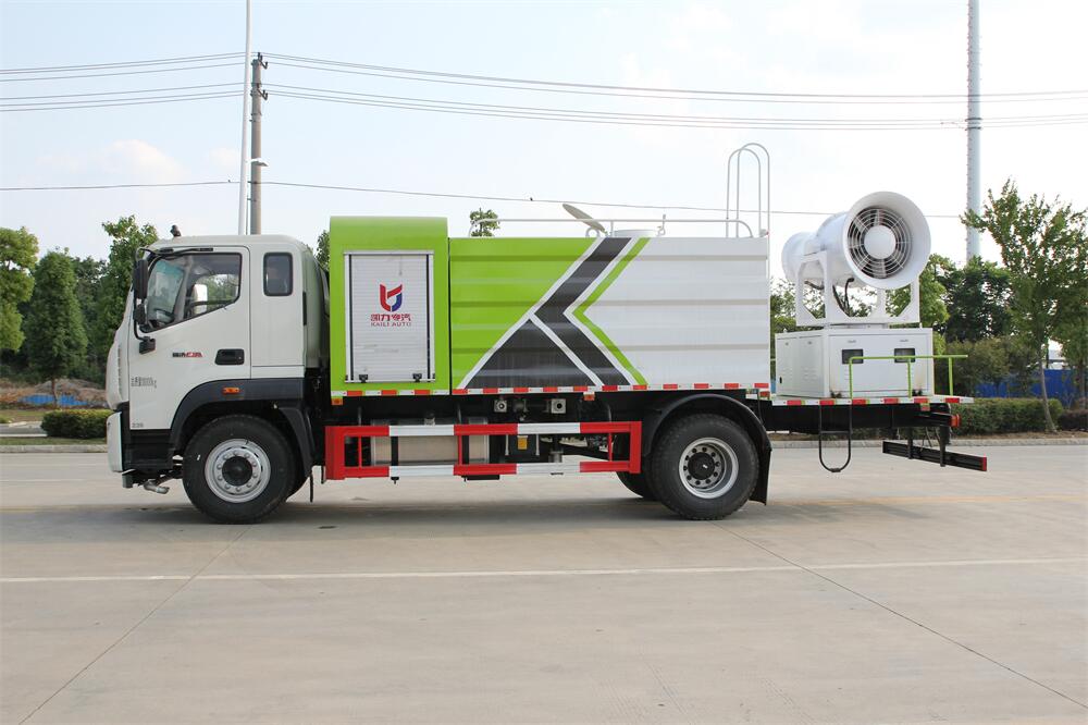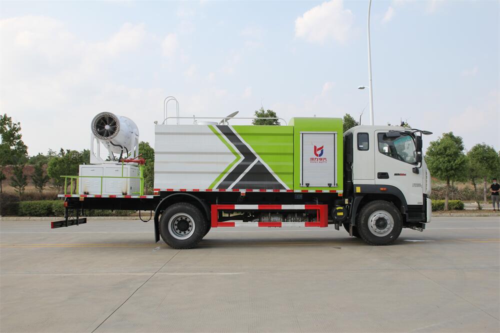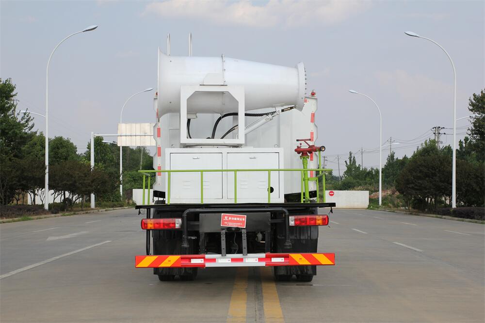 上裝配置:罐體容積為 12立方,選配風(fēng)送式霧炮機(jī)組射程30米、40米、50米、60米、80米、100米、120米霧炮,罐體鋼板為4mm碳鋼Q235材質(zhì),罐內(nèi)隔板具有防波作用,以減輕汽車行駛時罐體液體沖擊,罐體及整車外形尺寸按照公告。帶大功率專用灑水泵,泵可自吸自排,整車前沖、后灑、側(cè)噴、帶65消防接口,后平臺配CLW-50、CLW-60、CLW-80、CLW-100、CLW-120型風(fēng)送式霧炮機(jī)組;罐體前封頭配大功率柴油發(fā)電機(jī)組;前封頭帶水位計,后平臺主管路帶1寸澆花接口,后爬梯。帶兩根輸水管及陰陽端。罐體顏色:銀/灰/綠,罐體兩側(cè)噴“多功能抑塵車”字樣,貼反光標(biāo)示。