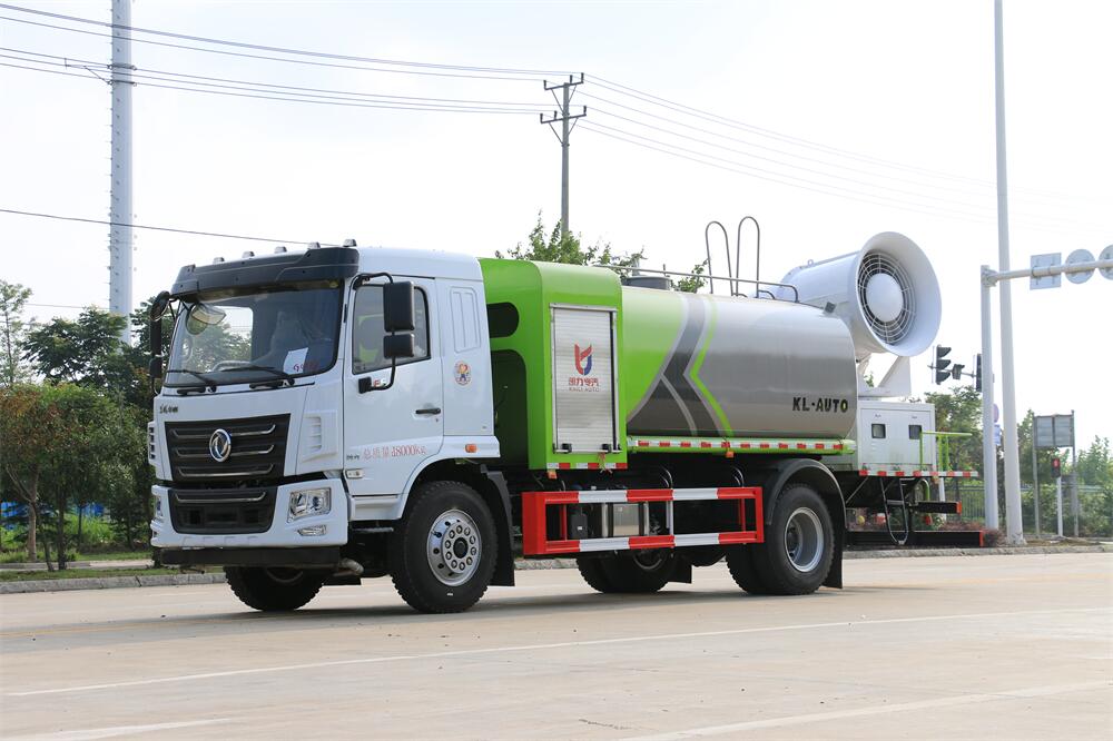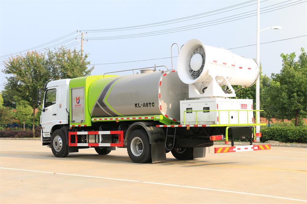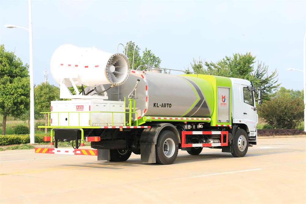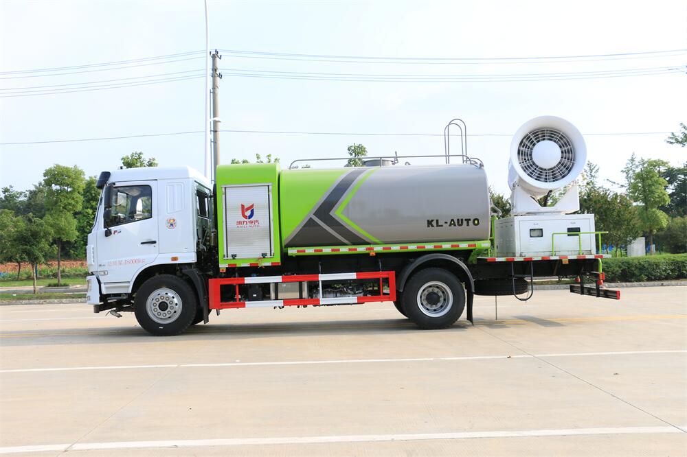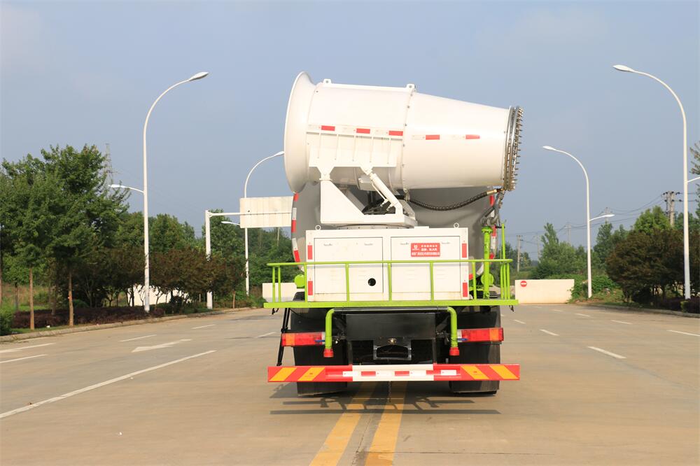 上裝配置:罐體容積為 12立方,選配風送式霧炮機組射程30米、40米、50米、60米、80米、100米、120米霧炮,罐體鋼板為4mm碳鋼Q235材質,罐內隔板具有防波作用,以減輕汽車行駛時罐體液體沖擊,罐體及整車外形尺寸按照公告。帶大功率專用灑水泵,泵可自吸自排,整車前沖、后灑、側噴、帶65消防接口,后平臺配CLW-50、CLW-60、CLW-80、CLW-100、CLW-120型風送式霧炮機組;罐體前封頭配大功率柴油發(fā)電機組;前封頭帶水位計,后平臺主管路帶1寸澆花接口,后爬梯。帶兩根輸水管及陰陽端。罐體顏色:銀/灰/綠,罐體兩側噴“多功能抑塵車”字樣,貼反光標示。