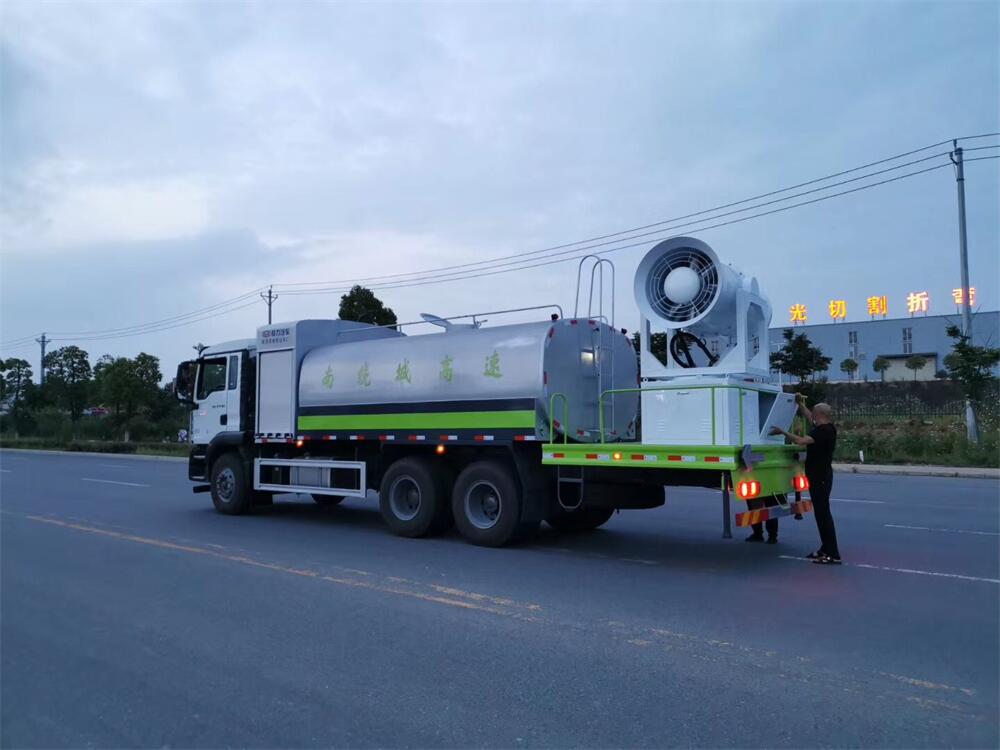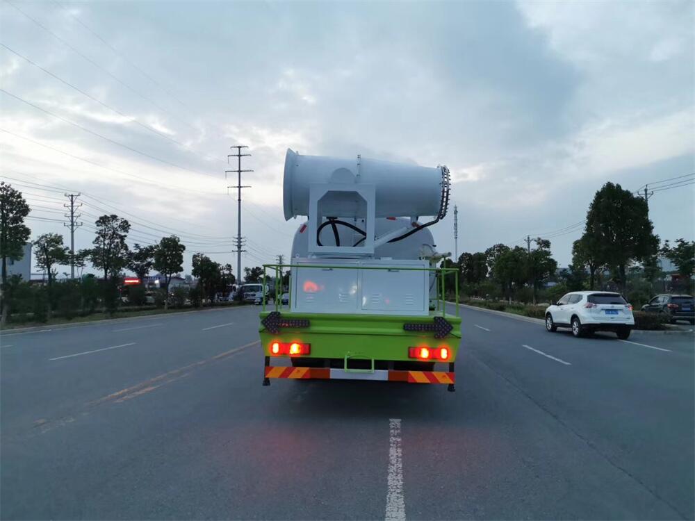 上裝配置:罐體容積為 16立方,選配風送式霧炮機組射程30米、40米、50米、60米、80米、100米、120米霧炮,罐體鋼板為4mm碳鋼Q235材質(zhì),罐內(nèi)隔板具有防波作用,以減輕汽車行駛時罐體液體沖擊,罐體及整車外形尺寸按照公告。帶大功率專用灑水泵,泵可自吸自排,整車前沖、后灑、側(cè)噴、帶65消防接口,后平臺配CLW-50、CLW-60、CLW-80、CLW-100、CLW-120型風送式霧炮機組;罐體前封頭配大功率柴油發(fā)電機組;前封頭帶水位計,后平臺主管路帶1寸澆花接口,后爬梯。帶兩根輸水管及陰陽端。罐體顏色:銀/灰/綠,罐體兩側(cè)噴“多功能抑塵車”字樣,貼反光標示。