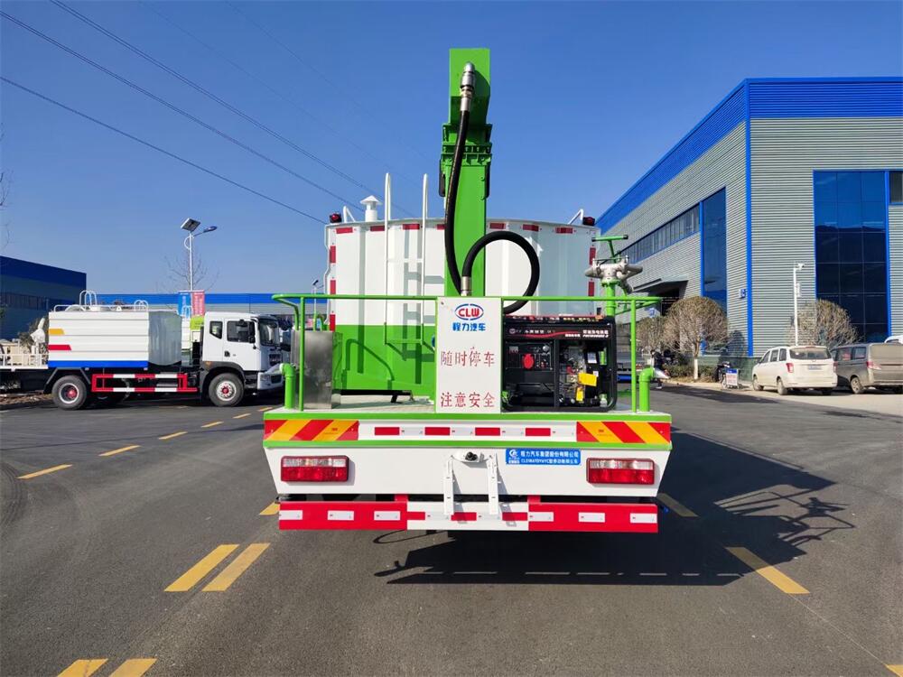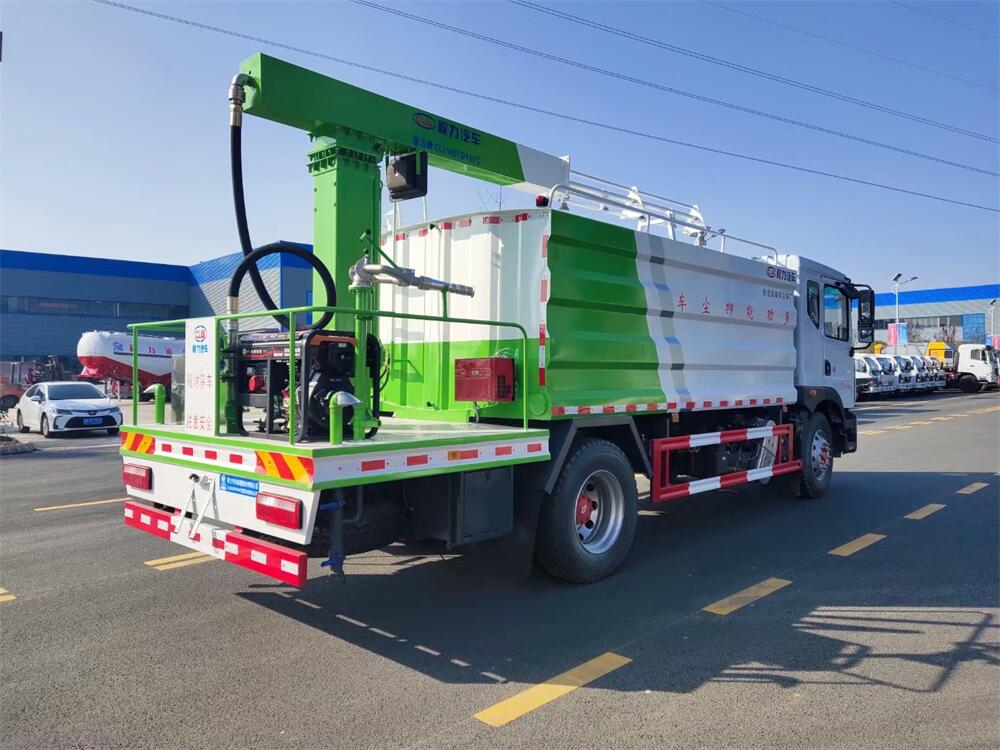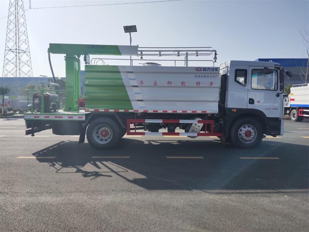 東風(fēng)D9多功能鐵路抑塵車,整車型號(hào):CL5186TDY6YC,底盤型號(hào):EQ1185LJ9CDE,總質(zhì)量:18000KG,整備質(zhì)量(車輛自重):9660 KG,額定載質(zhì)量:(上戶噸位):8145KG,4500軸距,大容積罐體滿載15立方(罐內(nèi)采用環(huán)氧玻璃鱗片防腐處理質(zhì)保兩年)、新穎的罐體設(shè)計(jì)使車輛行駛更穩(wěn)定、使用壽命更長(zhǎng),大容量方型水箱,前沖、后灑、側(cè)噴、高炮,抑塵噴灑桿(帶旋轉(zhuǎn)升降功能,液壓升降、液壓旋轉(zhuǎn))。噴灑桿離地3.5-5.6米 、180°旋轉(zhuǎn),后部平臺(tái)帶8KW柴油發(fā)電機(jī)組、電控箱。整車采用全智能駕駛室觸摸屏及遙控操作:車輛噴淋系統(tǒng)、攪拌、旋轉(zhuǎn)臂、加熱等等功能。灑水功能采用主機(jī)動(dòng)力。旋轉(zhuǎn)、升降、攪拌采用發(fā)電機(jī)組動(dòng)力,配電箱預(yù)留外接電源接頭套。噴淋系統(tǒng)加裝單車流量計(jì)(用于計(jì)量抑塵劑噴灑量。)