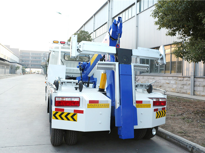 配3噸或者5噸上裝,進口閥液壓系統,雙側聯動操作,3噸或者5噸卷揚,25米鋼絲繩,兩節吊臂,兩節托臂,配拖叉與拖叉座,旋轉筒及L型拖叉。