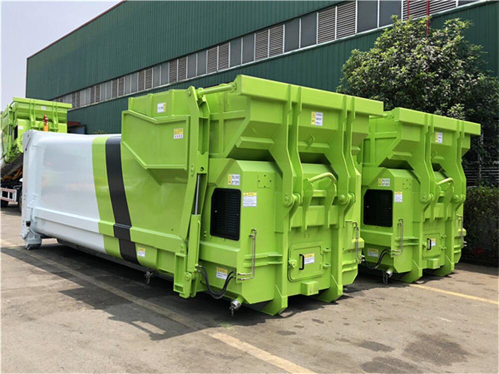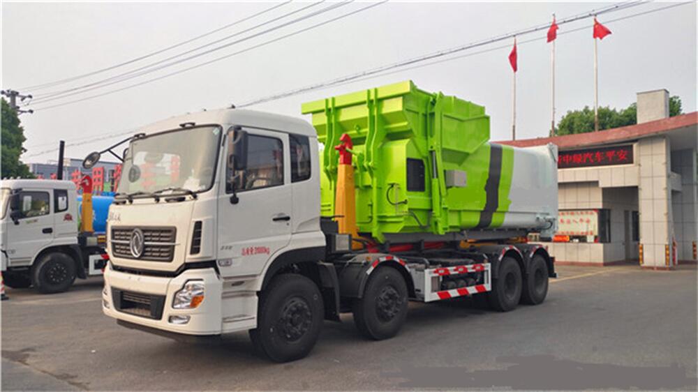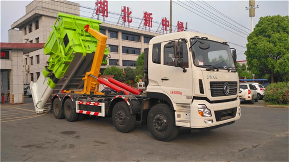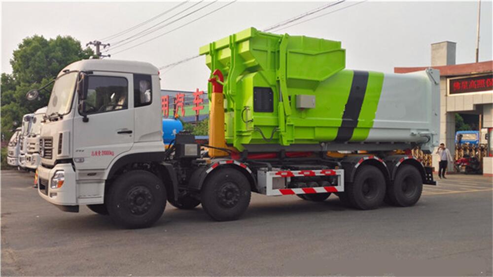 5、將汽車底盤倒進(jìn)車位,鉤起機(jī)箱,將垃圾運(yùn)往垃圾處理場(chǎng)。